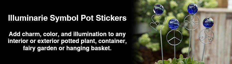 Enhance any landscape setting with our Illuminarie (glow-in-the-dark) hanging ornaments and windspinners.